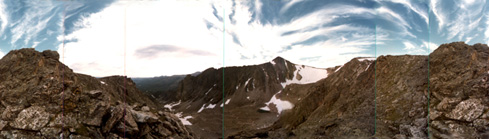 | This 360 degree composite panoramic image of 12,713 foot Hallett Peak in Rocky Mountain National Park shows the type of dramatic vista which can only be captured in a panorama having a wide vertical coverage. The vertical coverage of this image is over 120 degrees - an easy task with the OmniLens. A circular polar projection image can be converted to a rectangular format in the darkroom or with software. | |