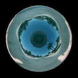 | The left image was taken from the center of an intersection with the prototype axial strut "Cassegrain" wide angle reflector which utilized an aspheric metalized plastic L'eggs egg. The angle of view is nearly 320 degrees and the central obscuration is 75 degrees. Panoramic overage is from about 70 degrees below the horizon to 52 degrees above. Some of my axial strut reflectors will cover even more - over 70 degrees above and below the horizon. The aspheric primary reflector points away from the camera, but its coverage is so wide that my fingers, elbows, and even parts of the camera appear on both sides of the image! (The newer Versacorp Omnirama T11 axial strut wide angle reflector has a larger diameter than this early prototype, allowing it to better "see around" the camera and photographer.) Note that the zenith is not at the center of this image, which was taken with a hand held camera having no level indicator. The ability to utilize hand held images which may be taken in more remote locations is why it is desirable to have software which can compensate for pointing errors. Uncorrected, this error will cause the horizon to be curved in a converted panoramic image. The right photo simulates the appearance of a "raw image" produced by the OmniLens. Note the absence of a central obscuration - a feature possible only with the OmniLens. In order to prevent obstruction of the subject by the photographer, the OmniLens should be used with a camera having a self timer or remote release, with the photographer either crouched under the tripod or at a good distance from it. The cost of the OmniLens can be lower if its coverage is limited to 320 degrees or so. | |