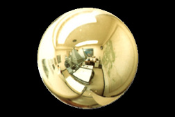 | While it looks like an ordinary fisheye picture, the left image covers nearly 360 degrees and has no central obstruction. It also has minimal radial compression of the subject near the edge of the picture, allowing all areas of the image to contain adequately detailed information. The OmniLens will produce this type of image. The object extending out to the lower right is the edge of a door which is actually behind the optical system! The image was taken in 1978 by attaching a spherical reflector to the edge of the door and photographing it from across the room with a 400 mm lens. The image was progressively expanded toward its perimeter to reduce radial image compression. One way to implement this is to use the Photoshop "speherize" filter in negative mode. The spherize filter can cause some loss in resolution. The right image shows a simulated "full frame" 360 degree image such as that possible with the OmniLens if it is made with zoom capability. A standard 180 degree fisheye lens would only cover a circle having a diameter slightly smaller than the short dimension of the picture. (The object pictured in the center is a Zeiss OT-3 orthophotoscope, which is used in photogrammetry to correct local differences in the scale of aerial photos that are caused by variations in the elevation of imaged land.) | |