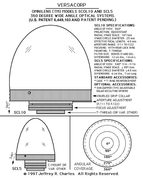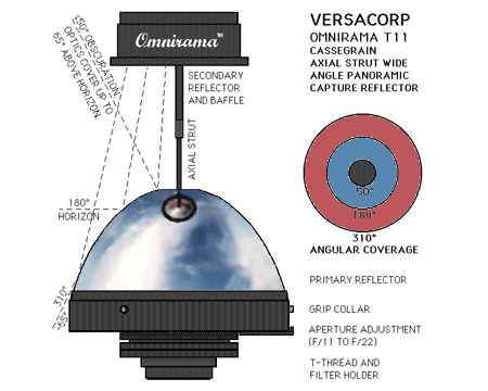 Pricing: Versacorp is offereing technology transfer opportunities to parties interested in purchasing licenses for this and related technology. However, while Versacorp holds the license, the Omnirama T11 can, under some circumstances, be acquired (typically in quantity) by special order. The unit price for low quantities (as available) is $3,795 and can be substantially lower for large quantity purchases. The T11w is currently the baseline version. Inquiries are invited from technical instrumentation representatives and from camera and scientific supply dealers. Custom configurations (including a an even wider field of view and "non-Cassegrain" versions) are available as special order items. Delivery (particularly of special order versions) is typically expected to be from 90 to 180 days from receipt of paid order, though this can often be expedited if a sufficient quantity of identical units is ordered at the same time.