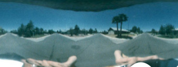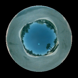 | The left image was taken from the center of an intersection with the prototype axial strut "Cassegrain" wide angle reflector which utilized an aspheric metalized plastic L'eggs egg. The angle of view is nearly 320 degrees and the central obscuration is 75 degrees. Panoramic overage is from about 70 degrees below the horizon to 52 degrees above. Some of my axial strut reflectors will cover even more - over 70 degrees above and below the horizon. The aspheric primary reflector points away from the camera, but its coverage is so wide that my fingers, elbows, and even parts of the camera appear on both sides of the image! (The newer Versacorp Omnirama T11 axial strut wide angle reflector has a larger diameter than this early prototype, allowing it to better "see around" the camera and photographer.) Note that the zenith is not at the center of this image, which was taken with a hand held camera having no level indicator. The ability to utilize hand held images which may be taken in more remote locations is why it is desirable to have software which can compensate for pointing errors. Uncorrected, this error will cause the horizon to be curved in a converted panoramic image. The right photo simulates the appearance of a "raw image" produced by the OmniLens. Note the absence of a central obscuration - a feature possible only with the OmniLens. In order to prevent obstruction of the subject by the photographer, the OmniLens should be used with a camera having a self timer or remote release, with the photographer either crouched under the tripod or at a good distance from it. The cost of the OmniLens can be lower if its coverage is limited to 320 degrees or so. | |