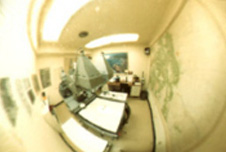 | While it looks like an ordinary fisheye picture, the left image covers nearly 360 degrees and has no central obstruction. It also has minimal radial compression of the subject near the edge of the picture, allowing all areas of the image to contain adequately detailed information. The OmniLens will produce this type of image. The object extending out to the lower right is the edge of a door which is actually behind the optical system! The image was taken in 1978 by attaching a spherical reflector to the edge of the door and photographing it from across the room with a 400 mm lens. The image was progressively expanded toward its perimeter to reduce radial image compression. One way to implement this is to use the Photoshop "speherize" filter in negative mode. The spherize filter can cause some loss in resolution. The right image shows a simulated "full frame" 360 degree image such as that possible with the OmniLens if it is made with zoom capability. A standard 180 degree fisheye lens would only cover a circle having a diameter slightly smaller than the short dimension of the picture. (The object pictured in the center is a Zeiss OT-3 orthophotoscope, which is used in photogrammetry to correct local differences in the scale of aerial photos that are caused by variations in the elevation of imaged land.) | |