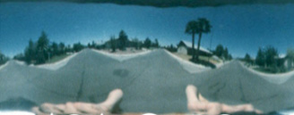 | These images are digitally "unwrapped" versions of the above left circular image. The left rectangular image was made by using digital image processing to convert ("unwrap") the circular image to a rectangular format panorama (e.g. polar to rectangular coordinates). One way to do this is simply use the "Polar Coordinates" filter in Adobe Photoshop, then normalize the vertical proportions with the "Scale" command. Note the curved horizon which results from the camera not being pointed exactly straight up. The pointing error was corrected in the right image by decentering the circular image so that the horizon was as close to concentric with the center as possible, then all of the steps used for the left image were simply repeated. The horizon circle becomes elliptical when the camera is not pointed straight up, so this process is not a perfect solution; but it certainly is a simple one. The entire process took only a few minutes, but it could all be automated with the right software. The wide dark area at top center is from the decentered central obscuration of the axial strut reflector - not a problem with the OmniLens! The "unwrapped" image can be made longer than 360 degrees (in order to have overlap) by simply making a copy of the round image, rotating it to an angle which corresponds to the desired amount of overlap, then converting it to a second image strip which can be merged with the first. Rotation angles divisible by 90 degrees are recommended when it is necessary to maintain the highest possible resolution. | |